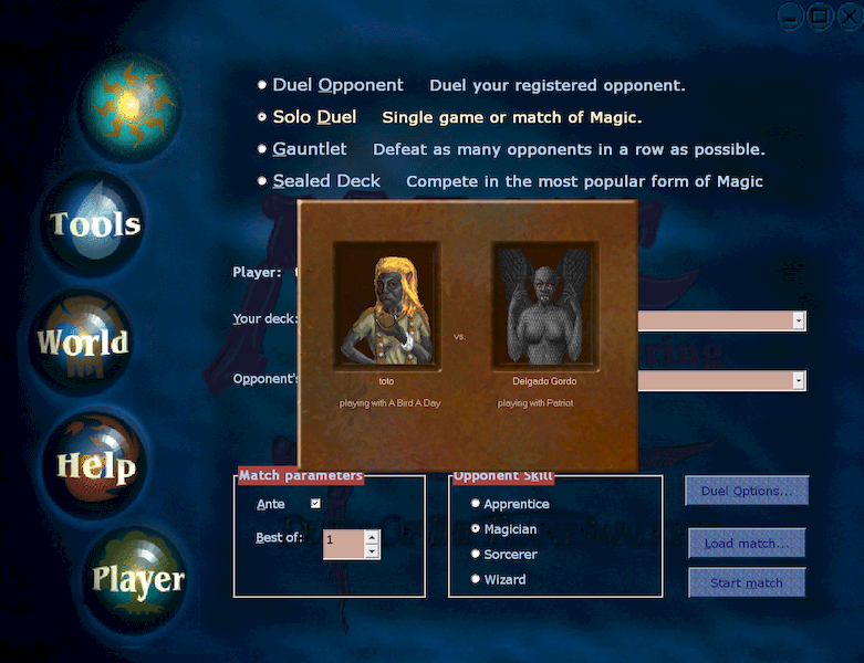 J'ai aimé les choix offerts avant le duel : choix de son deck, de celui de l'adversaire, partie unique, parties jusqu'à la défaite, deck scellé, mise de jeu, restrictions de types, etc. On se retrouve vite dans les options, pas de soucis, Microprose a bien travaillé l'interface qui reste lisible et agréable. Hormis le son ! Impossible de trouver comment le désactiver lors des duels. J'ai fini par renommer les répertoires Sounds et Duelsounds :)
