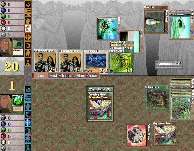 Le jeu fonctionne bien, si ce n'est un plantage parfois: il préfère Windows 95, il faut mieux jouer avec le mode compatibilité de Windows. Donc chaque partie se déroule de manière rigoureuse, un peu trop même. Si l'on vient à cliquer un peu trop vite, on va avancer à la phase suivante sans le vouloir et impossible d'annuler. Cela peut se comprendre en duel avec un humain, ça l'est moins face à l'ordinateur qui pourrait être un peu conciliant. Car à cliquer vite (on clique pour tout et tout le temps dans ce jeu) on en vient à passer de la phase unfreeze à upkeep (par exemple) par erreur et tant pis pour la carte particulière qu'on devait dégager manuellement ! Perdre des parties sur un seul mauvais clic, ça vous arrivera et pas qu'une fois. Ce genre d'erreurs est plutôt fréquent au début, à la longue on devient plus attentif. Concernant les phases de tour, on peut décider d'en éviter certaines (on passe à la suivante aussitôt) et de s'arrêter systématiquement sur d'autres, bon point pour cette personnalisation possible.