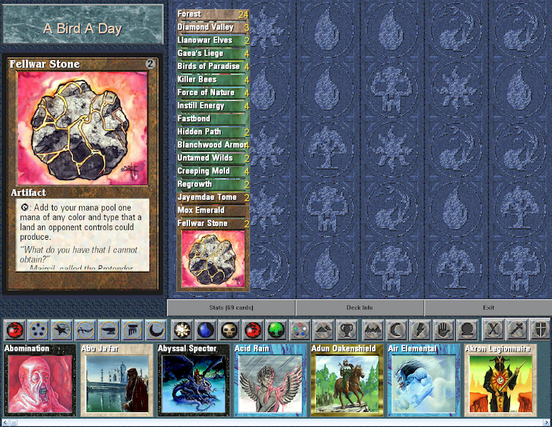 Et puisque toutes les cartes sont disponibles dans le deck builder, la limite financière n'existe pas. C'est la fête, à moi les black lotus :) Je n'ai donc joué qu'en parties libres et ce fut bien plus intéressant ! Le jeu est livré en 4è et 5è édition avec un bloc Astral jamais publié sur papier. Beaucoup de choix, une ergonomie acceptable et c'est parti pour des decks...verts. Chacun ses goûts hein !